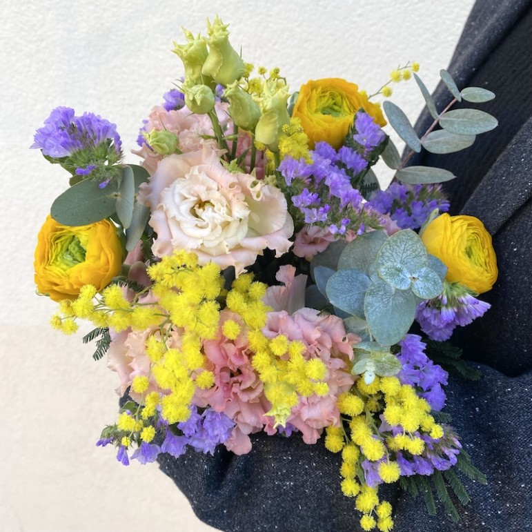 Ce bouquet lumineux et coloré d'inspiration anglaise est composé de renoncules et de mimosa de saison, produits dans le sud de la France.